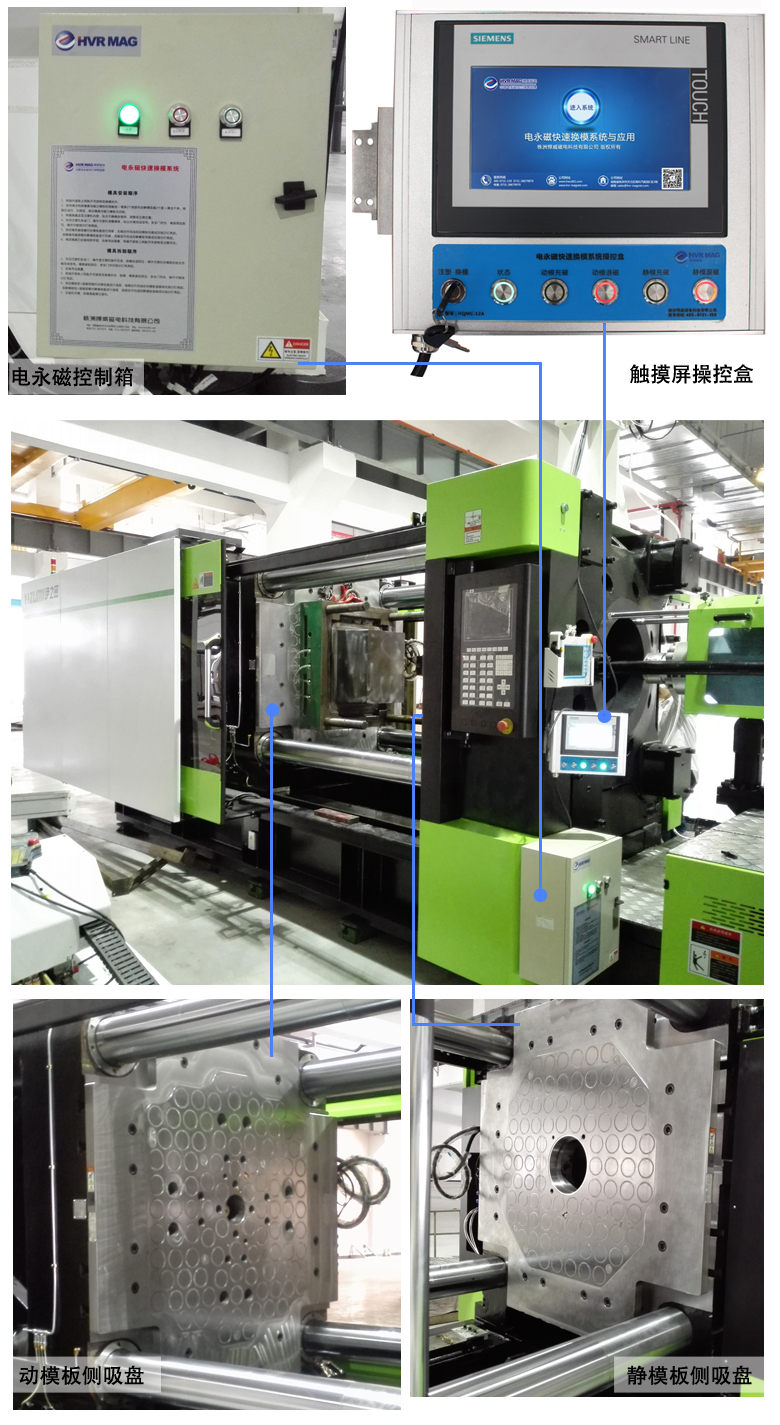 改善后:換模時間縮短到1-3分鐘,磁力均勻分部于模具,與磁極面全面接觸,更好的保證了合模精度,提高質量,減少耗損,模具使用壽命提高50%以上。