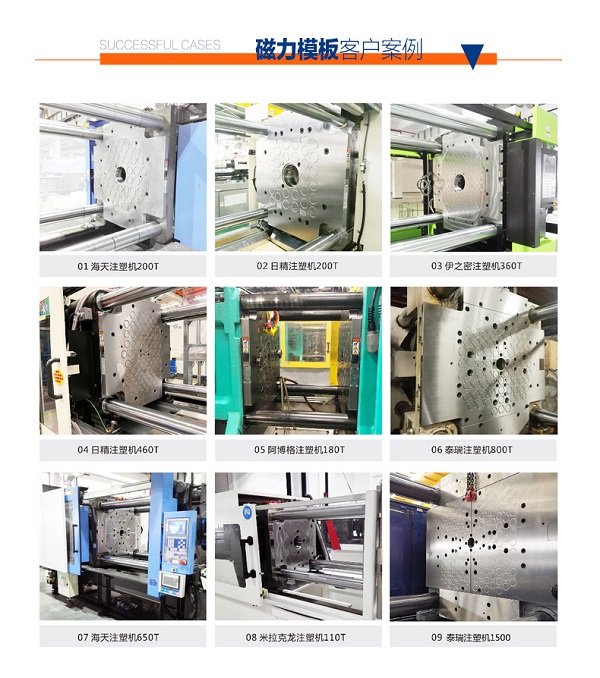 該系統(tǒng)的特點(diǎn)是:結(jié)構(gòu)和控制非常簡(jiǎn)單,沒(méi)有任何機(jī)械的夾緊元件和動(dòng)作,在模具背板與吸盤磁極的接觸面上,無(wú)論是中心還是外圍,都有電永磁夾緊。 適用于各種形式,規(guī)格的注塑機(jī)。